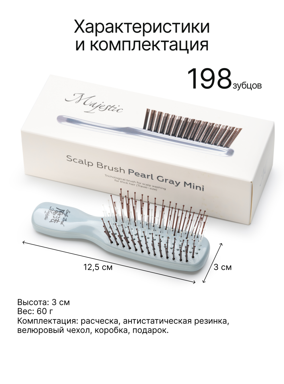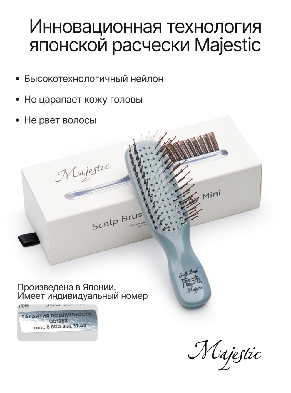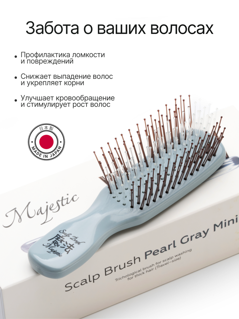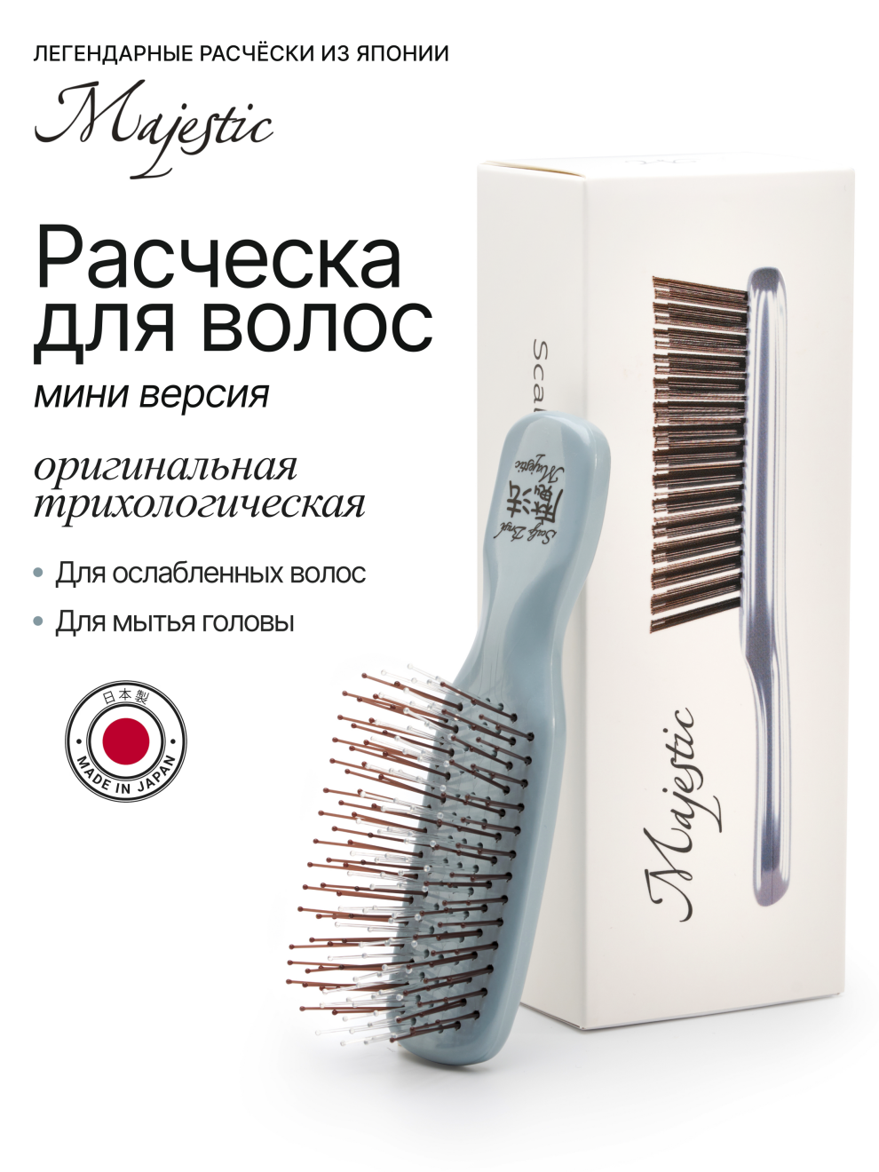 Мягкая массажная расческа Majestic Scalp Brush серая (travel-версия) — это уникальная трихологическая расчёска, созданная японскими учёными для очищения кожи головы, которая станет вашим незаменимым помощником в уходе за волосами.