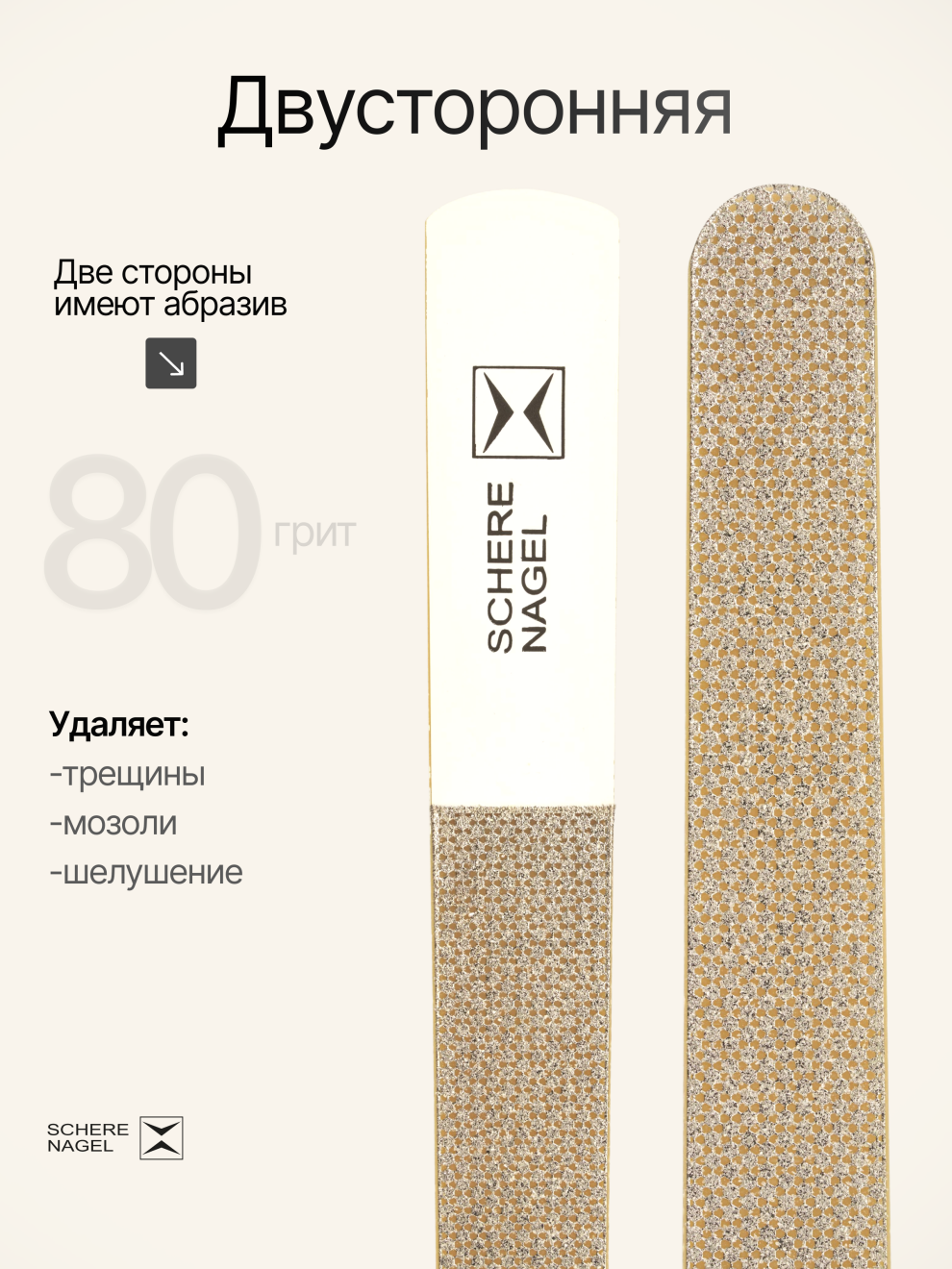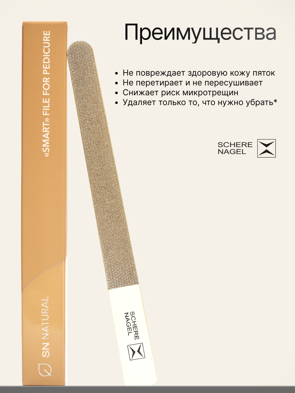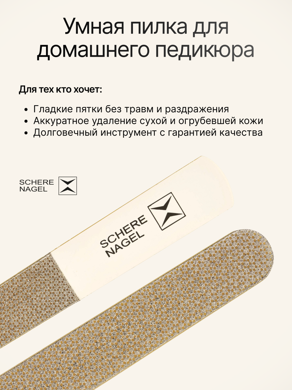 Педикюрная пилка Schere Nagel эффективна и безопасна даже для сухой и чувствительной кожи, а при ее использовании не требуется размягчать и распаривать кожу, что экономит ваше время. Запатентованное алмазное покрытие обеспечивает качественное удаление огрубевшей кожи и гарантирует высокую прочность самой пилочке. Инструмент отличается от умной маникюрной пилки увеличенной площадью и большей абразивностью (жесткостью).