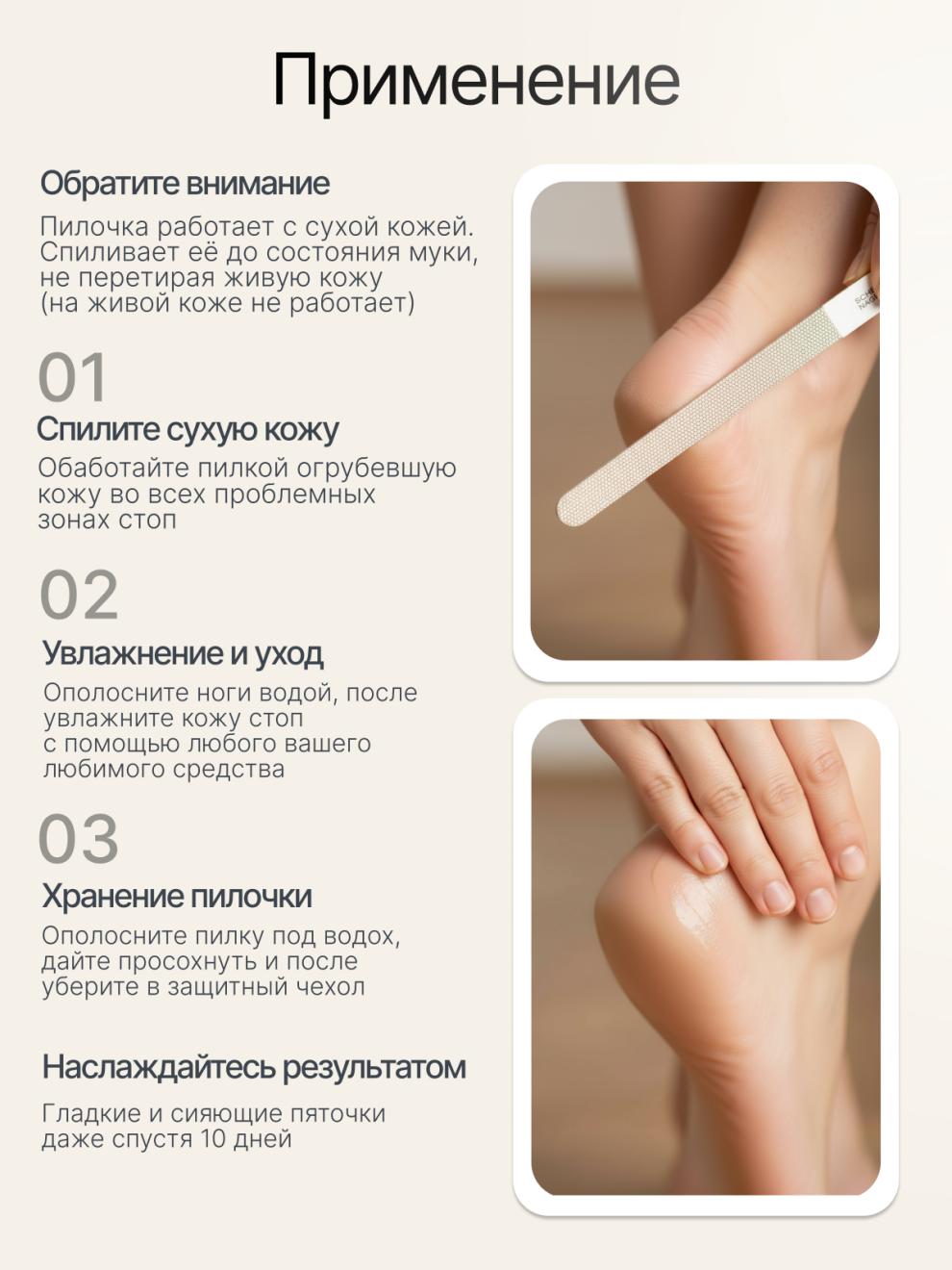Всего несколько движений – и пилочка спиливает все сухие участки кожи, не травмируя при этом живую ткань.