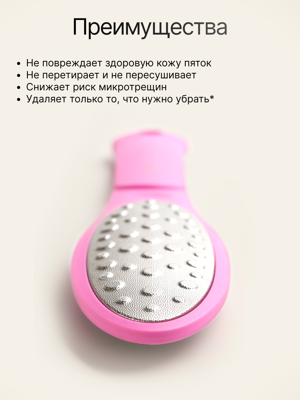 Всего 5-7 минут – и кожа стоп нежная и мягкая, а Вы ощущаете приятный массажный эффект. Тёрка одинаково эффективна как на сухой, так и на влажной, распаренной коже.