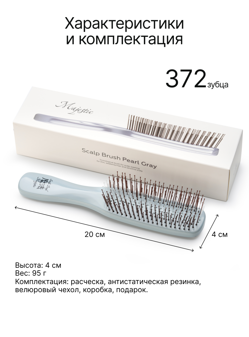 Расческа имеет 372 зубчика. Зубчики выполнены из гибкого износостойкого нейлона. Две линии зубчиков (длинные и короткие), верхний ряд зубчиков с литыми закругленными наконечниками. Эргономичная ручка.