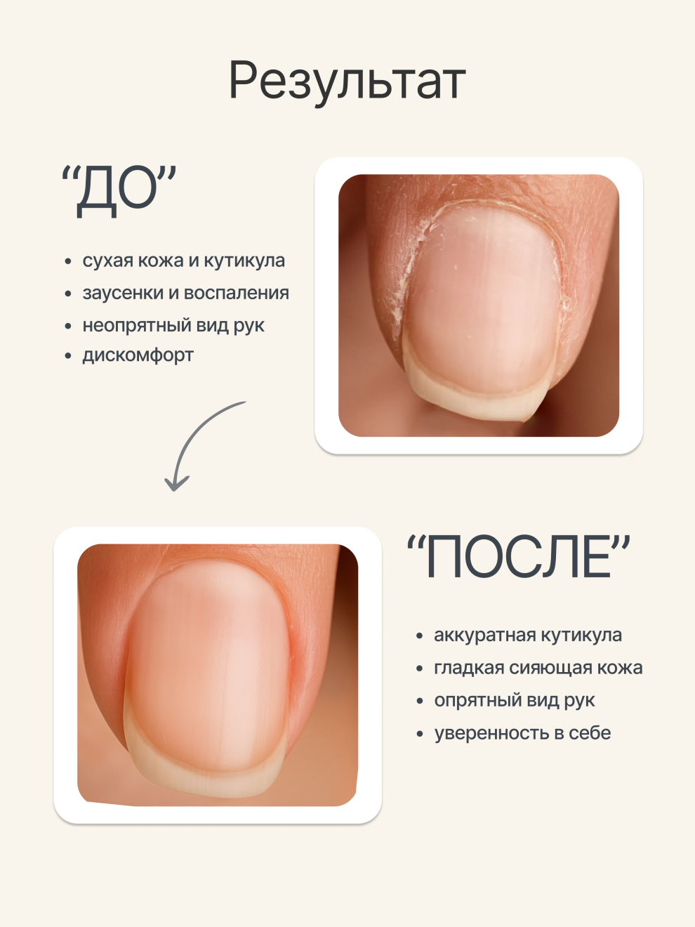 Перед началом процедуры не следует распаривать или обрабатывать кутикулу размягчающим средством – весь процесс осуществляется на сухой коже. Всего за несколько движений по кутикуле кожа становится мягкой на ощупь, ровной, ухоженной.